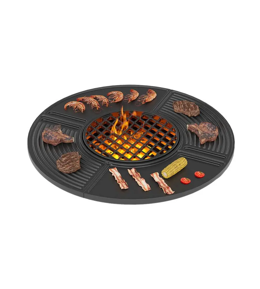 Чугунная плита Gurman Ø700 состоит из двух секторов. Каждый сектор за счёт формы литья разделён на две части. Часть с гладким основанием позволяет жарить на очаге продукты, как на обычной сковородке. Часть с ребристым основанием, как у сковороды-гриль, предназначена для получения красивого узора на готовых продуктах.
