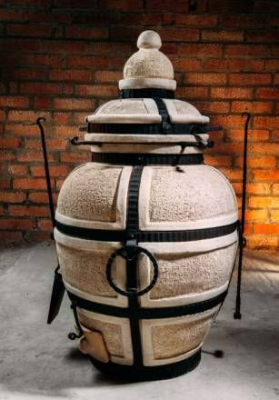 Тандыр «Сармат Большой», благодаря своим размерам и форме, может быть укомплектован дополнительно четырехъярусной средней этажеркой, крюком (например, для бараньей ноги) или двойным шампуром для кусков нестандартного размера. Изготавливается из шамотной массы. Стальная окантовка — гнутьё с элементами ковки. В комплект входят: Шампуры 8 штук