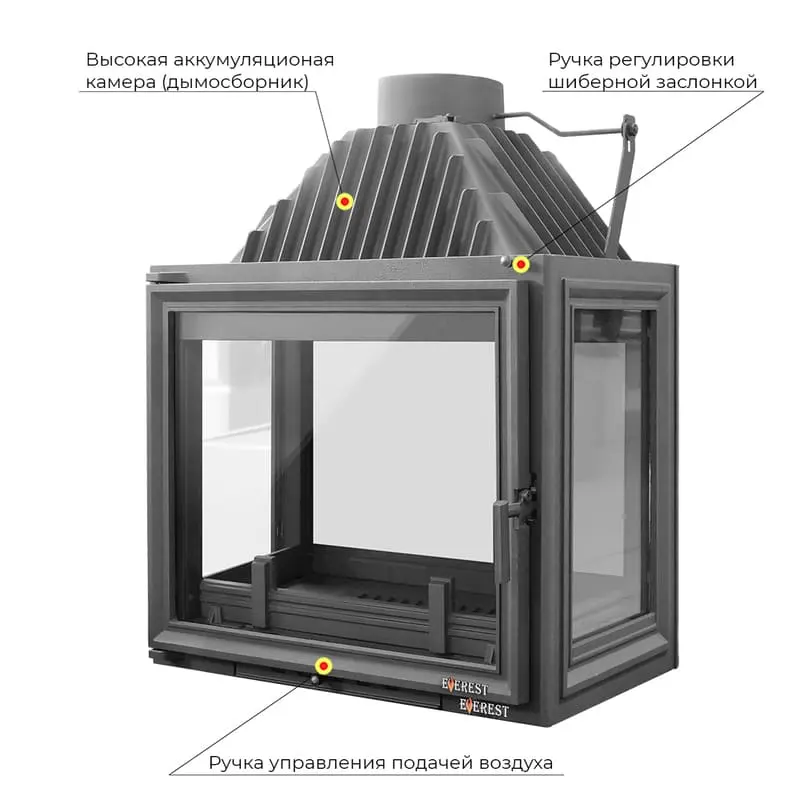 Каминная топка EVEREST A16Н две двери Каминная топка EVEREST A16H имеет топочную дверь установленную как с передней, так и с задней части. Топка изготовлена из качественного жаростойкого чугуна (ГОСТ 1412-85) с толщиной стенок 6-10 мм. Вес топки составляет кг. Модель рассчитана на обогрев помещений объёмом до 320 м³. Каминная топка имеет высокую Аккумуляционную камеру (дымосборник) и часто расположенные радиаторы на корпусе топки, которые обеспечивают высокий КПД и увеличивают мощность до 16 кВт. В Аккумуляционной камере (дымосборнике) установлен чугунный пламегаситель, Патрубок дымохода с внутренним диаметром 203 мм, оснащён поворотным шибером. Заслонка изготовлена из чугуна, а её положение регулируется ручкой на передней панели топки.