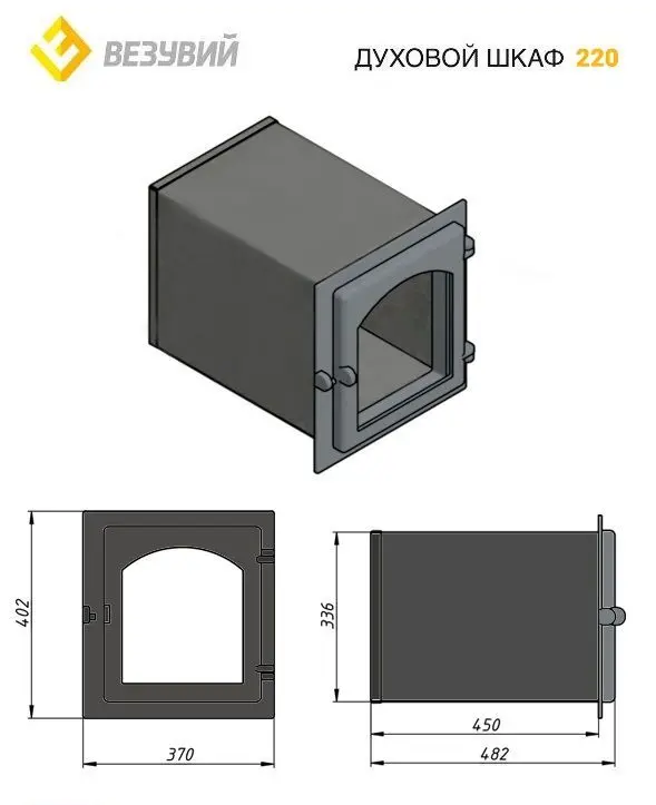 Духовка фирмы Везувий представлена в цвете антрацит. Модель изготавливается из комбинации чугуна и стали, дверца выполнена из чугуна, а корпус сделан из стали. Духовой шкаф устанавливается в кирпичную печь или мангал и предназначен для приготовления и разогрева пищи.