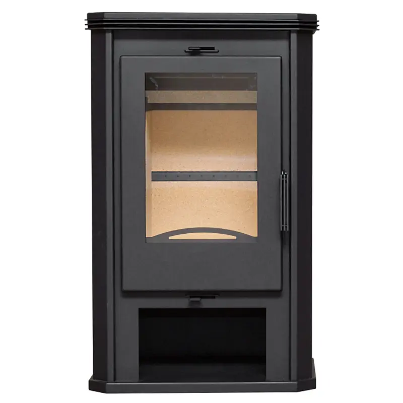 Печь рассчитана на установку в небольшом загородном доме, в коттедже или на даче. Максимальная площадь обогрева составляет 70 кв.м. Печь-камин выполнена из стали, трапециевидный корпус окрашен черной термостойкой эмалью, большая дверца с жаропрочным стеклом с обеих сторон подчеркнута облицовкой светлой керамической плиткой.