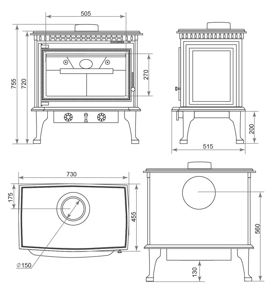 Патрубок дымохода – универсальный, со сменным положением. Он может быть установлен сверху или сзади в зависимости от размещения печи в помещении.