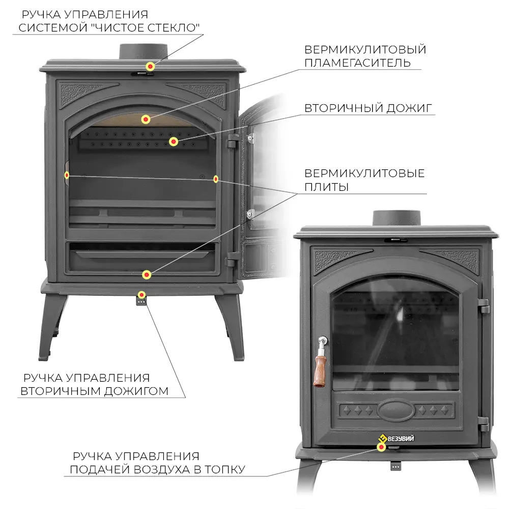 Топочная камера футерована вермикулитом, который повышает КПД и ресурс изделия за счет равномерной отдачи тепла.