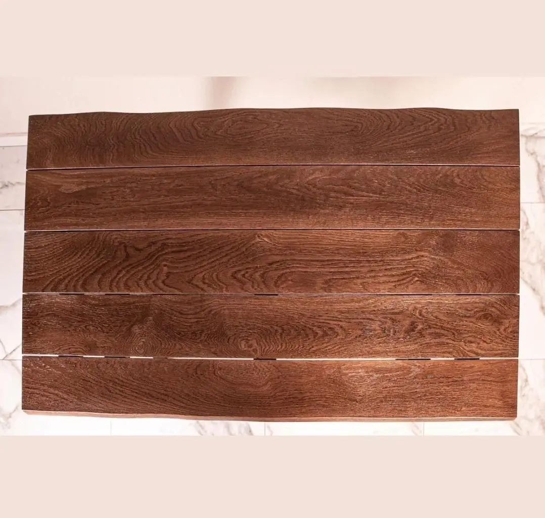 Столешница изготовлена из массива дуба, состоит из нескольких ламелей. Толщина столешницы составляет 23-24 мм. Поверхность подвергнута брашированию, покрыта лаком тёмного оттенка.
